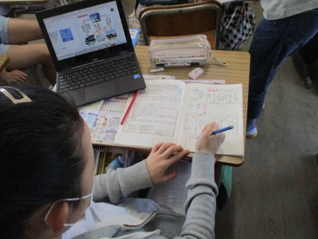 4年生 国語の時間に聞き取りメモの工夫について学習しています。メモを取ることの必要性や大切さを教科書から見つけ出しました。