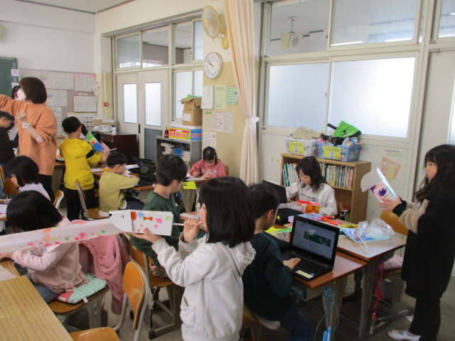 お昼休みの様子 曇っていましたが、暖かくなりました。みんな元気いっぱい運動場で遊んでいます。1年生 図工の時間に楽しい作品を作りました。ストローで空気を入れると中からビニールが出てきて膨らみます。